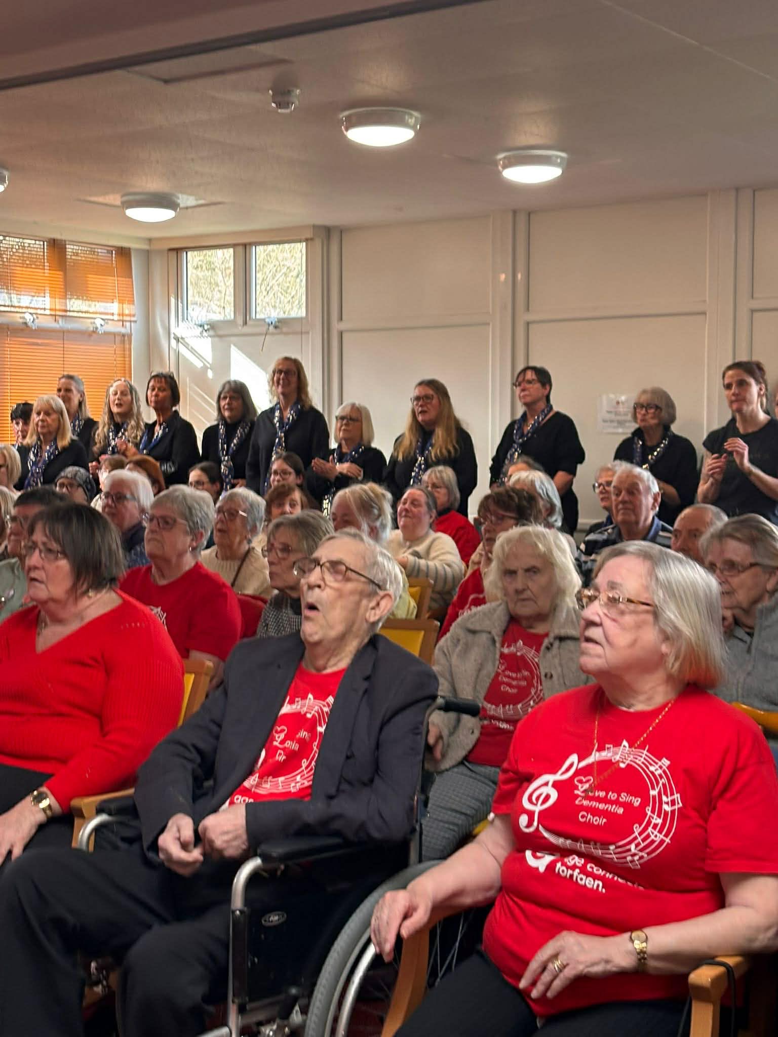 In an exclusive afternoon of song, feet were tapping and hands clapping as Allegra evoked the spirit of carnival when they opened with the samba beat of 'Cantate Brasilia' before performing 'On my Own' from 'Les Miserables', which proved a popular choice as the dementia choir enjoy singing songs from musicals. Marking the forthcoming Valentine's Day with a beautiful tribute to loved ones was 'Count the Stars', and Allegra closed with another song from the musicals: 'This is the Moment' from 'Jekyll and Hyde', as arranged by their Musical Director. Audience members comprised the dementia choir, carers, and staff, and were visibly moved by the songs chosen and gave Allegra enthusiastic and sustained applause. Creating a shared experience that championed the role of choirs in bringing people together through music, Allegra and Love to Sing merged for Paloma Faith's 'Make Your Own Kind of Music' and 'This is Me' from 'The Greatest Showman'. Allegra were then served with refreshments and Welsh cakes as a thank you for them taking the time to perform.